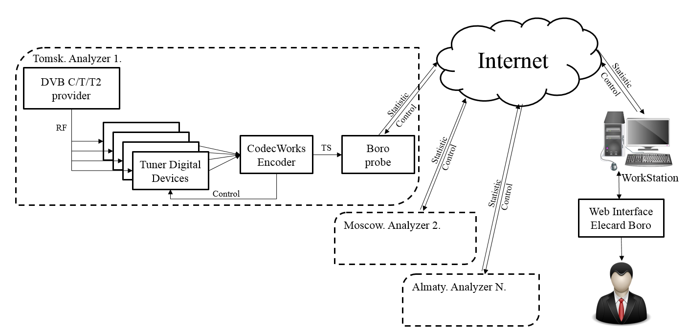 Применяются карты захвата под управлением ПО Elecard CodecWorks Encoder. Транспортный поток направляется в localhost или в один из доступных сетевых интерфейсов, откуда его захватывает анализатор Boro. Поток может быть как в исходном MPTS формате с различными таблицами, так и ремультиплексированным на SPTS потоки. Поддержки формата T2MI нет.