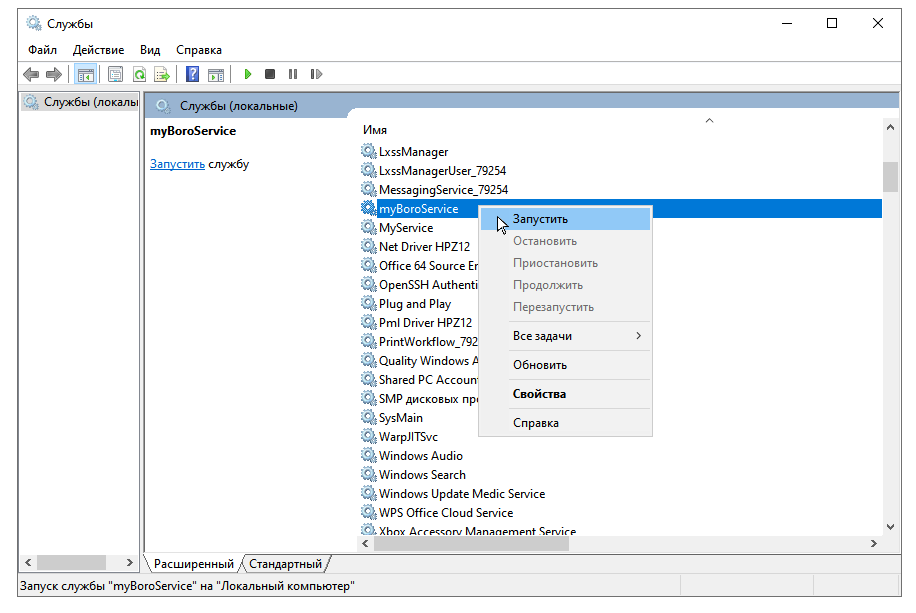 services.msc. Найдите и запустите установленную службу myBoroService.