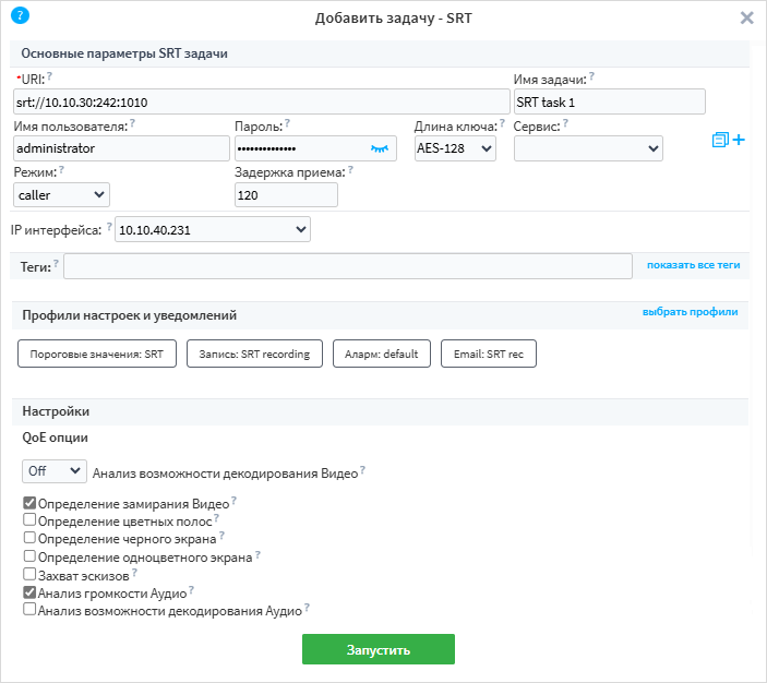 srt://0.0.0.0:portдля прослушивания любых входящих соединений по IPv4. Чтобы прослушивать любые входящие соединения по протоколу IPv6, укажитеsrt://[::]:port. Версия зонда 2.2: укажитеsrt://:portдля прослушивания любых входящих соединений по IPv4 и IPv6.username и password (опционально) — имя пользователя и пароль для доступа к зашифрованному потоку. Пароль должен содержать не менее 10 символов. Параметры применятся, только если они не были заданы через настройки задачи.