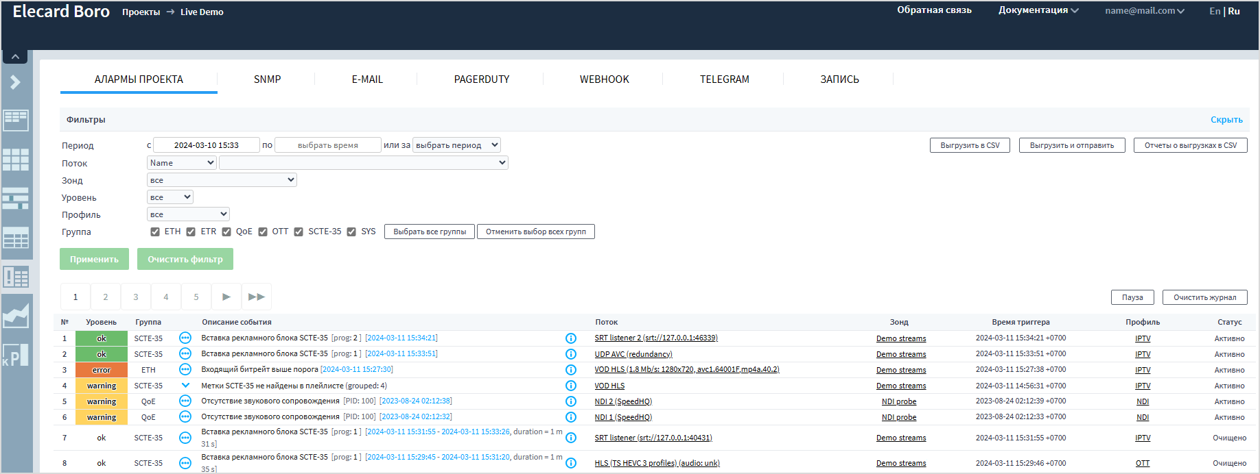 ETH— Ethernet-предупрежденияETR— ошибки, определенные стандартом ETSI TR 101-290QoE— ошибки, связанные с качеством восприятияOTT— ошибки, связанные с доставкой видеосигнала через InternetSCTE-35— ошибка распознания меток SCTE-35SYS— системные ошибки