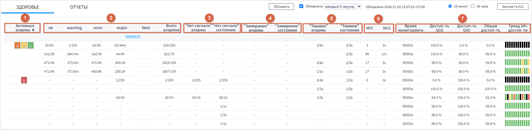 Перечисленные данные представлены статистикой за последние 24 часа или за 15 минут, что позволяет оценить состояние после ликвидации аварийных ситуаций. При необходимости дальнейшего анализа или сохранения статистики данные таблицы могут быть экспортированы в XLS-файл.
