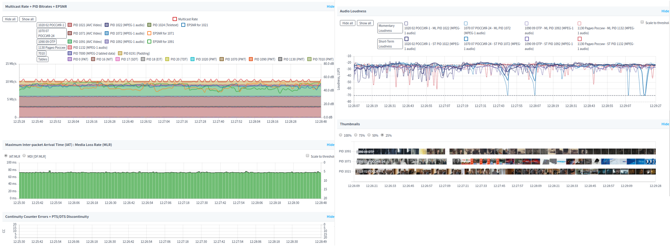 EPSNR- Estimated Peak Signal to Noise Ratio, измеряется в децибелах (dB) для каждого видеопотока;Bitrate- битрейт (бит/с) каждого PID, обнаруженного в потоке;DownloadRate- Скорость скачивания или Скорость потока, в зависимости от типа анализируемого источника. Измеряется в бит/с;IAT_MDI- объединяет три метрики, связанные с передачей IPTV потоков по сети: Maximum Inter-packet Arrival Time (maxIAT) - максимальное время между приходящими пакетами, в мс; Media Lose Rate (MLR) - количество потерянных транспортных пакетов; Delay factor (DF) - время в мс, которое показывает сколько данных должен держать клиент в буфере для плавного проигрывания контента;AudioLoudness- объединяет две метрики, связанные с измерением громкости по стандарту EBU R 128-2011: Мгновенная громкость (Momentary Loudness) и Кратковременная громкость (Short-Term Loudness) в LUFS;VideoDecodability- оценка возможности декодирования на основе подсчета кадров;Thumb- ссылки на эскизы для каждого видеопотока;CC- количество ошибок Continuity Counter в транспортном потоке за одну секунду (согласно ETSI TR 101 290 p1.4);ClockDiscontinuity- неравномерность временных меток PTS/DTS, количество ошибок за секунду.