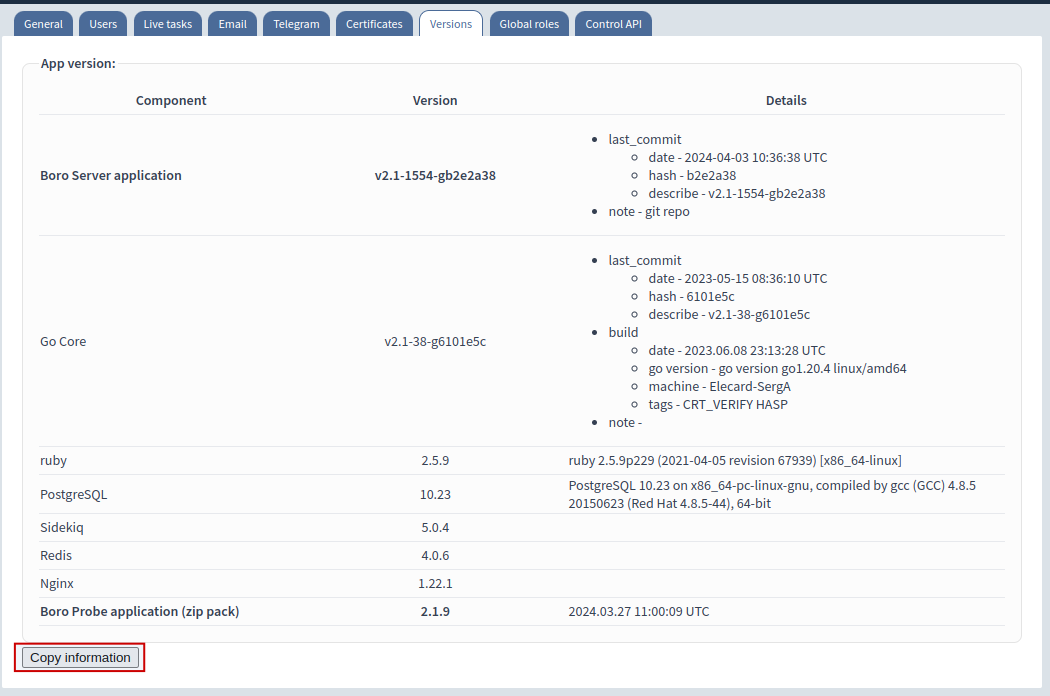 http://HOSTNAME_OR_IP/admin?tab=versionsсделайте скриншот или воспользуйтесь кнопкой копирования информации.